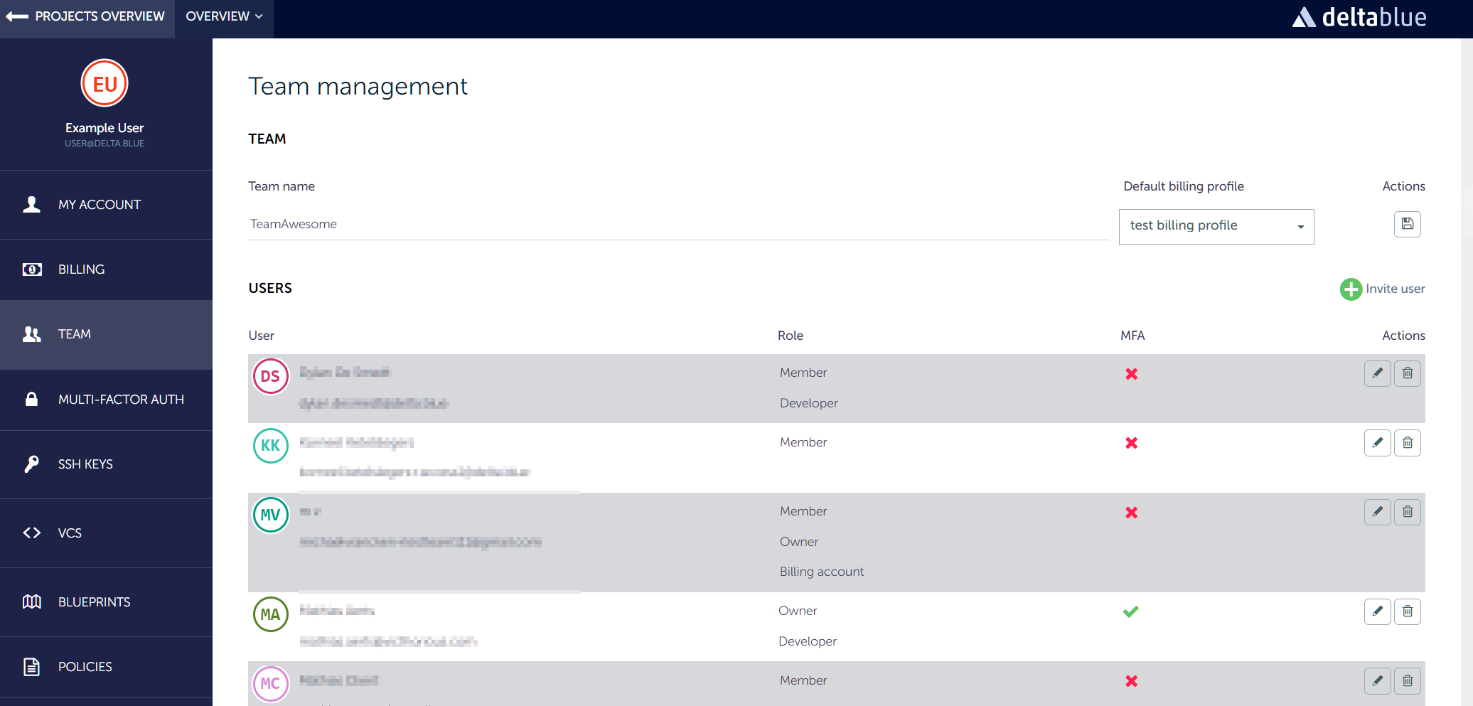 In the DeltaBlue Cloud Platform, the team plays a pivotal role in access management, with the owner having full control over team membership and role assignments. Here's an overview of team management and the roles that can be assigned:
