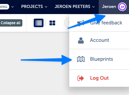 The blueprints overview can be found when clicking on your name in the top right of your screen. You can select 'Blueprints' from the dropdown menu.