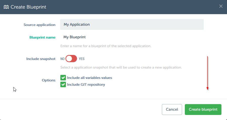 Creating a blueprintCreating an application blueprint can also be done by navigating to your applications overview, selecting the application you would like to create a blueprint of, clicking “Options”, then “Create blueprint”. Finally, select the desired options for your new blueprint to finalize your new application blueprint.