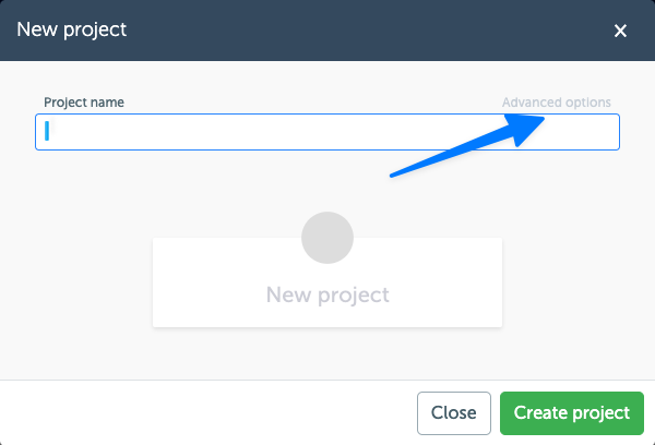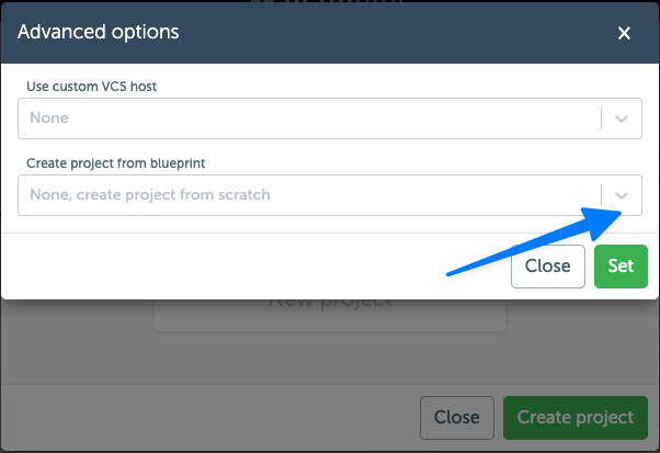 Creating a new project from a blueprintAside from using the blueprints page to create a new blueprint, you can also create a new project by pressing the "Create project" button on the project overview page. In the modal that opens, you will see an "Advanced options" button. By clicking on this button, you will be able to select a blueprint to use as a starting point for your new project.