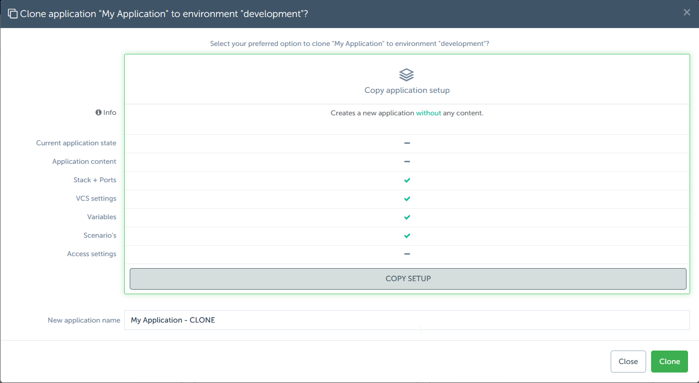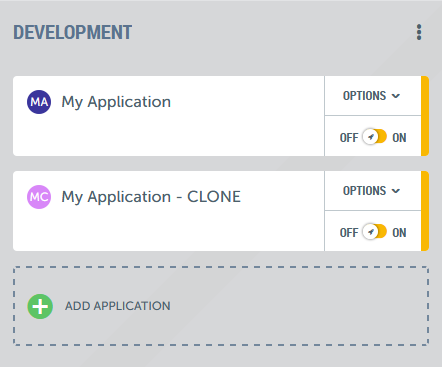When cloning the application within the same environment, a separate application will be made that has no relation to where it was cloned from. When there are multiple environments, you will see that this cloned application will be placed in a dedicated swimlane. When cloning an application from one environment to another, the relation to its source will be kept, causing it to be in the same swimlane as its source.