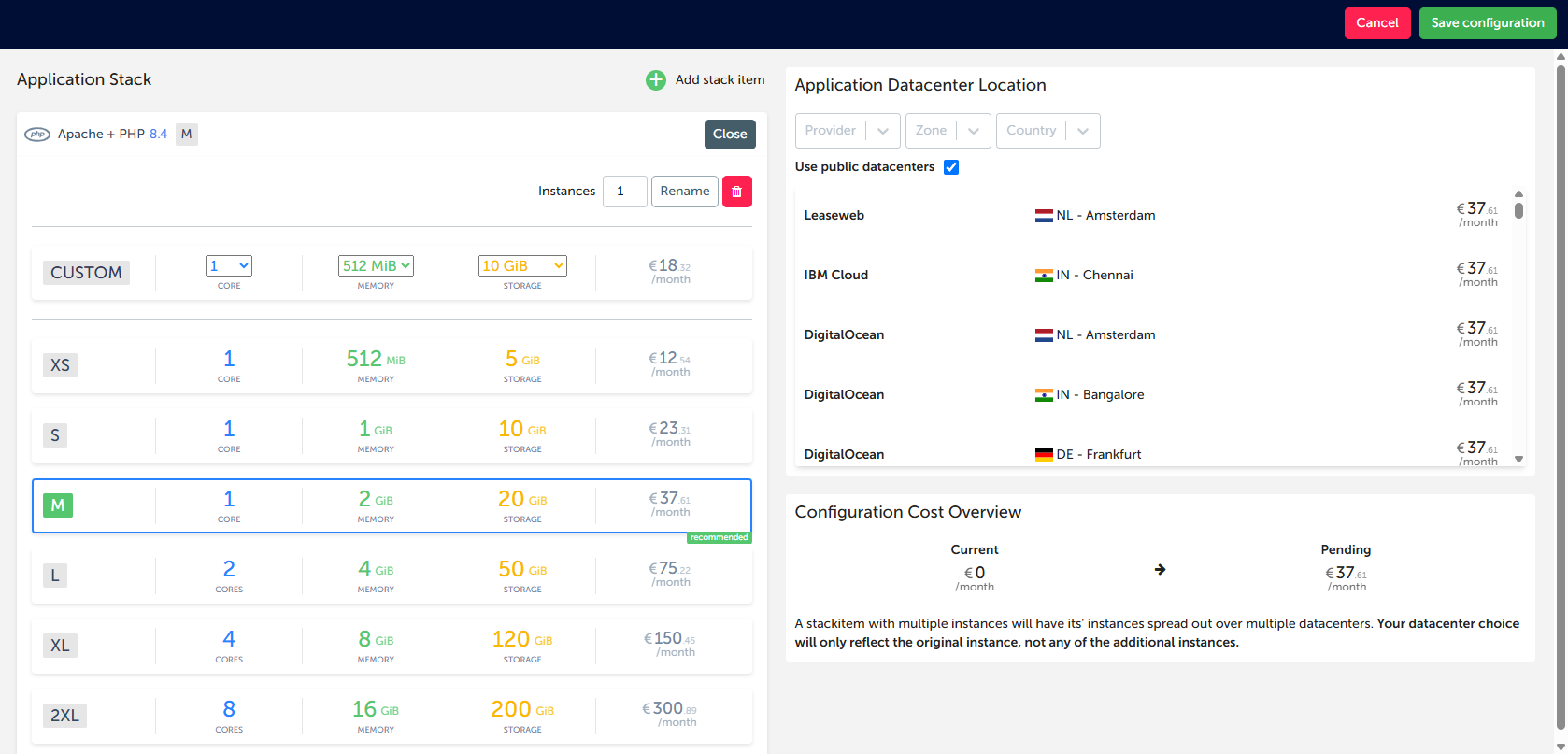 For each stack item, assign the resources it requires by clicking the Edit button. We offer various resource sizes, each clearly outlining what's included and the associated costs.