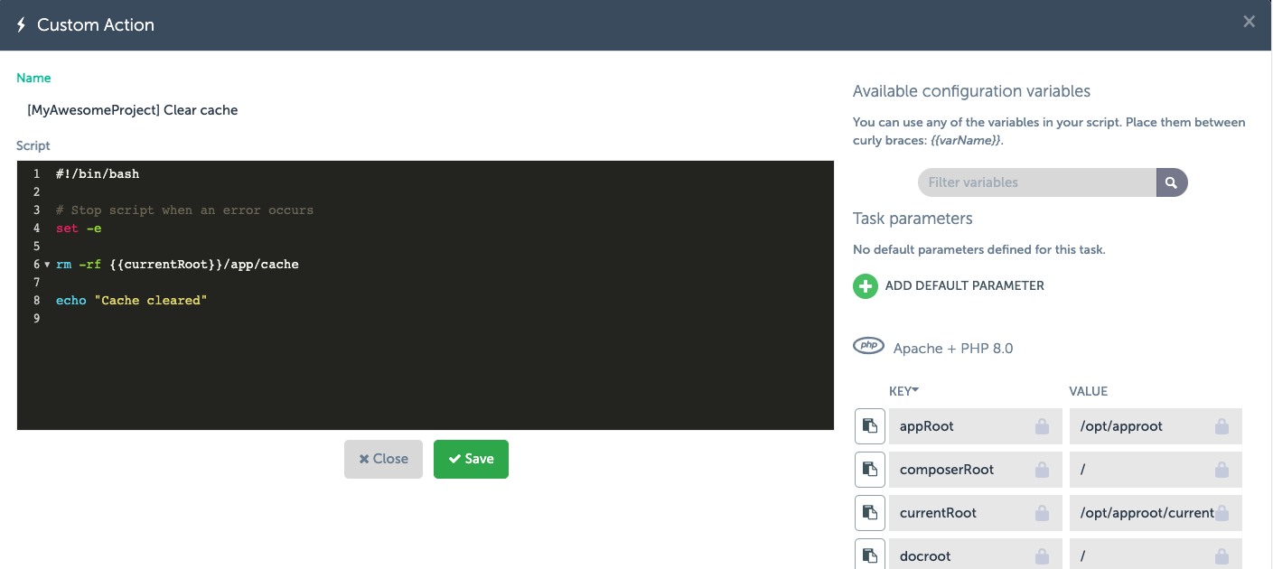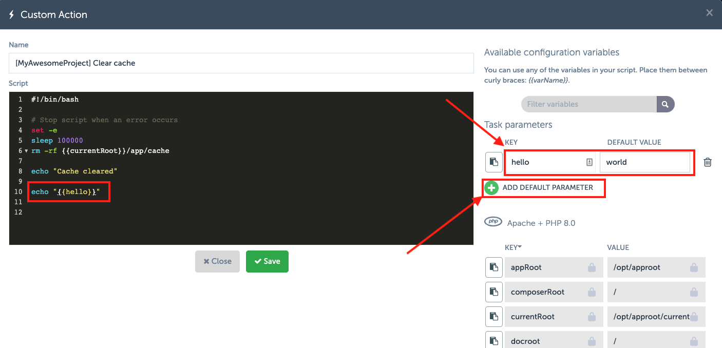 On the right side of the screen, click on the “Add default parameter”. Enter a value in the “key” field and a value in the “default value” field. For demonstration purposes, we use “hello” as key and “world” as default value. In the script screen, we type: echo {{hello}}. Then we save the action.