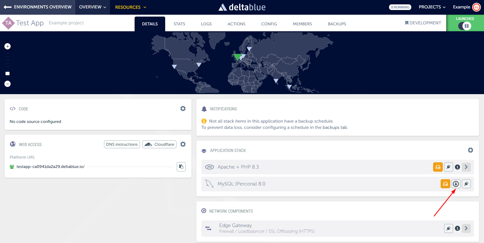 If your application includes a database stack item, generating a database exports becomes straightforward. This feature is accessible within the 'Details' tab as illustrated below.