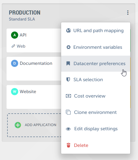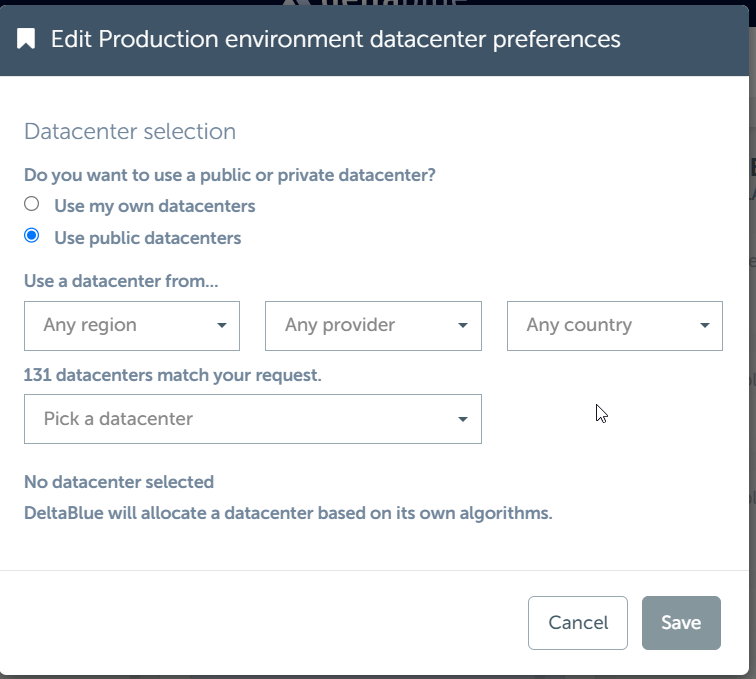 In the DeltaBlue Cloud Platform, you have the capability to manage datacenter preferences directly at the environment level. This feature enables you to select datacenters based on their specific criteria, ensuring optimal performance and compliance with regulatory requirements. Here's how you can manage your datacenter preferences: