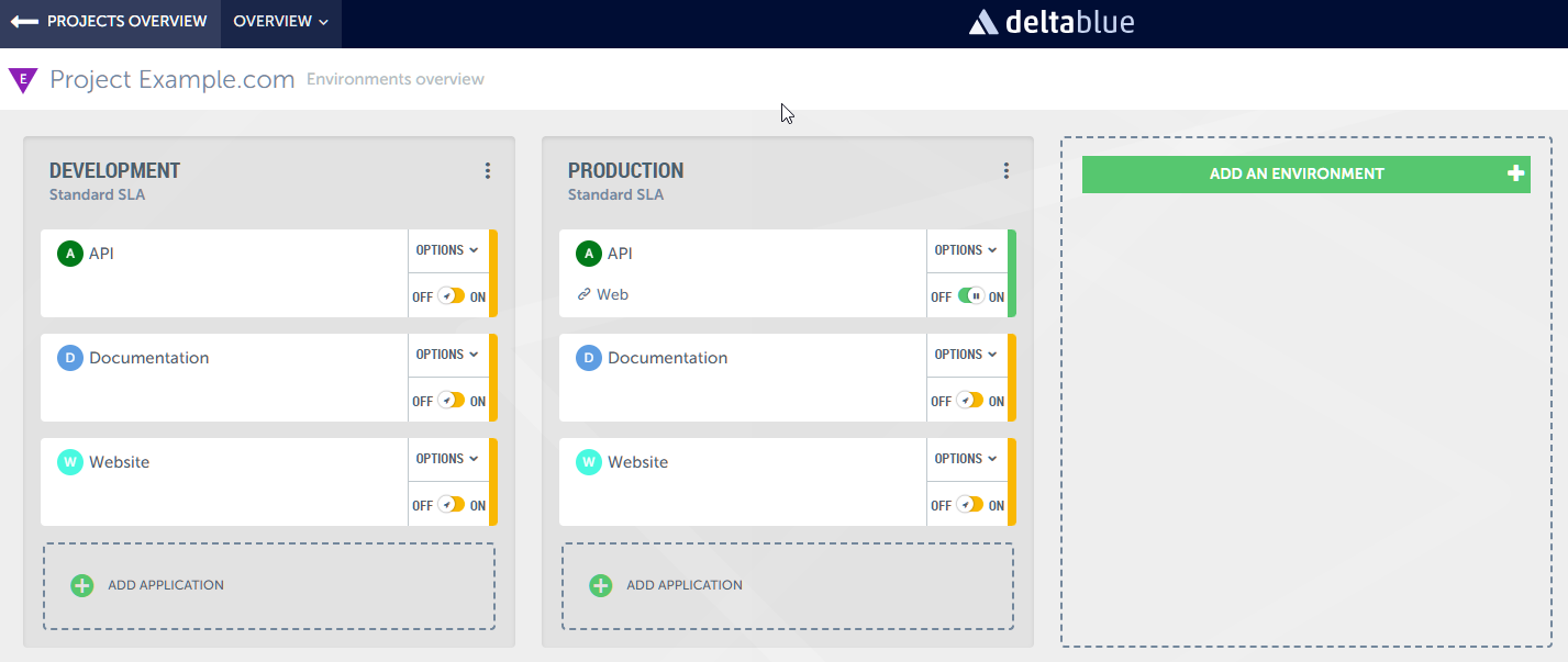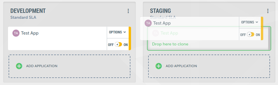 Example: deploying from Development to StagingIt's very simple if you have an application in the development environment that you want to deploy to staging. Simply drag and drop the application tile from the development environment to the staging environment.
