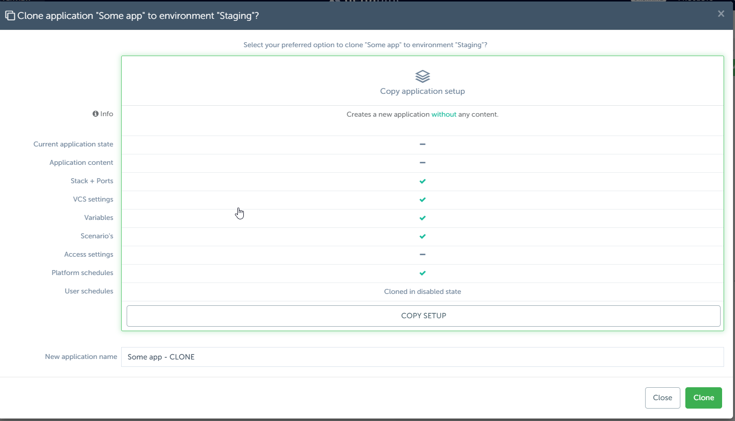 However, certain items such as: application state, application content, and access settings will not be cloned. This preserves the integrity of your staging environment and preventing unintended changes.