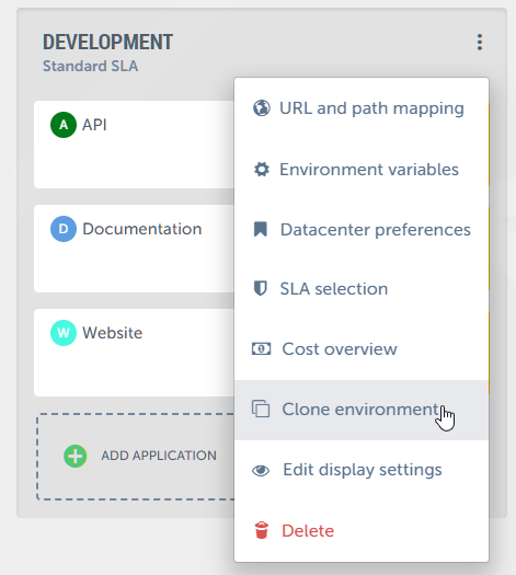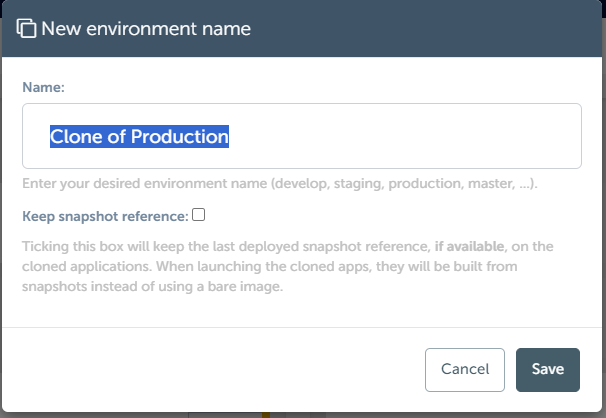 Cloning entire environmentsIn addition to deploying individual applications, our platform offers users the capability to clone entire environments effortlessly. In just one action, including all applications within them. Here's how you can leverage this feature to streamline your deployment process: