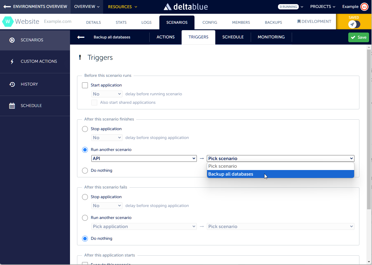 Execute another scenario after the scenario fails or succeedsYou can trigger another scenario when the current scenario fails or succeeds. This scenario can be of a different application in the same environment. Using this system, you can set up complicated multi-application logic, should the need arise. Possible use cases are to automatically execute a rollback scenario after a failed deployment scenario, or clearing a cache after a successful deploy. It can also be useful if a specific setup requires complex interdependent initialization/deployment orchestration between multiple systems.