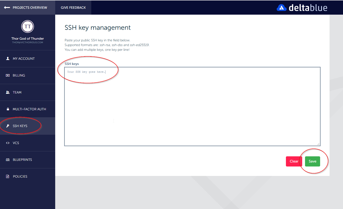 In the menu on the left, click on “SSH keys”. Paste the content of your public key in here (the filename of your public key ends with “.pub”). Click the green “Save” button.
