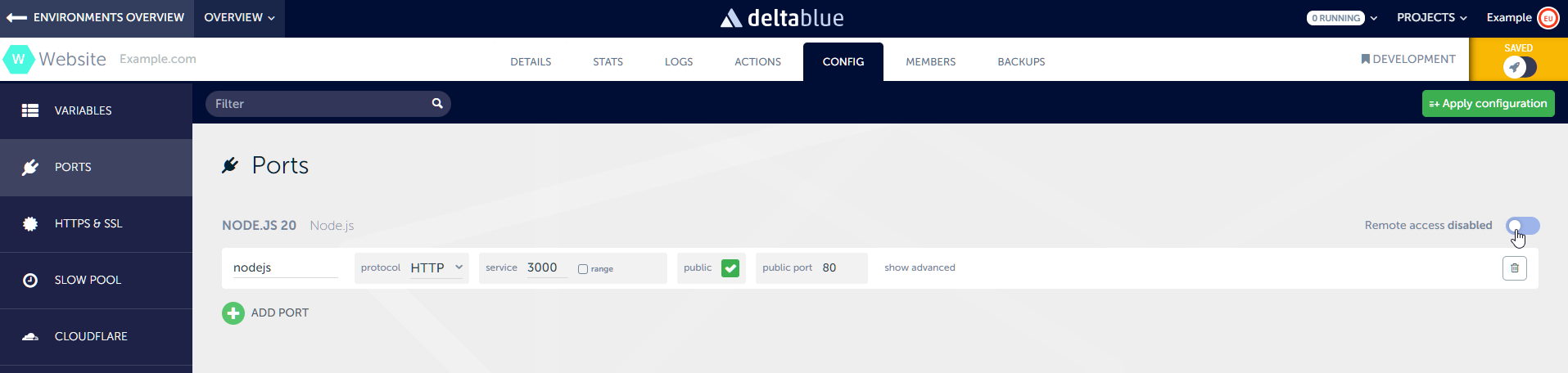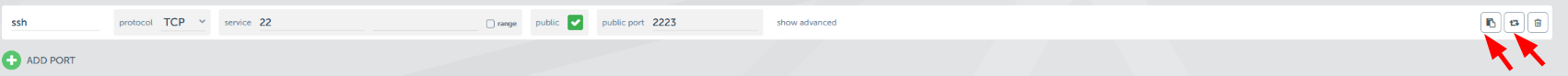 Enable SSH on your stack itemNavigate to the application in which the container is situated that you want SSH access to. On the application detail page, click on “Config” and then in the menu on the left on “Ports”. If the toggle on the right says “Remote access disabled”, click the toggle to enable it. This can take a few seconds. When this is completed, you’ll see that a line is added with the name ‘ssh’ and a public port. This public port is the ssh port on which you can connect.