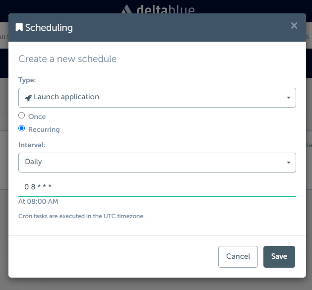 Once you've configured the schedule to your preferences, confirm the details and save the scheduled action. DeltaBlue Cloud Platform will then automatically execute the specified action at the defined intervals, ensuring consistent and efficient operation of your applications.